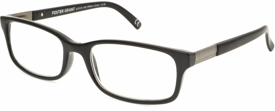 Foster Grant® BOSTON Men’s Reading Glasses boast a black acetate frame with a decorative metallic band on both temples. Rectangular classic lens shape.