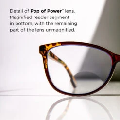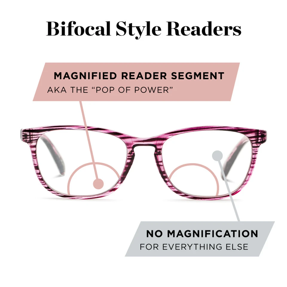 Get just the pop of magnification you need to read with Pop of Power® Bifocal** Style reading glasses. Each lens features a magnified reader segment at the bottom; the rest of the lens is unmagnified. And the whole lens helps to filter 30% of potentially harmful blue light* produced by computers and other artificial and natural sources, including the sun. So, you can keep your glasses on—and your vision clear—when you shift between reading and looking up to see across the room or interact with others.