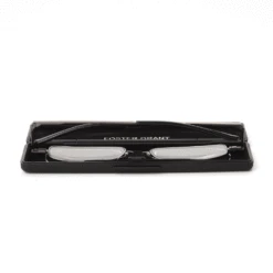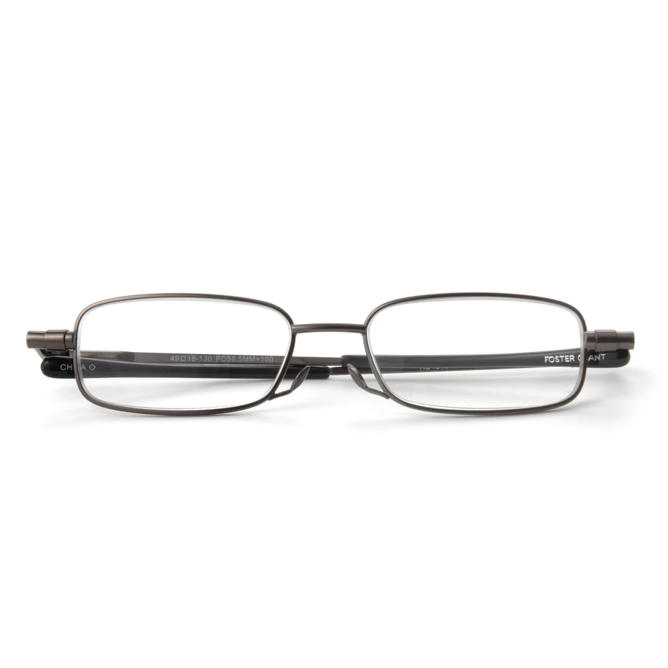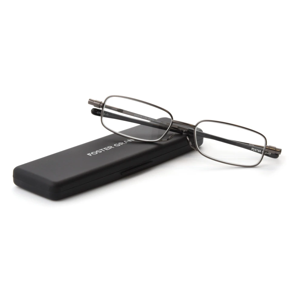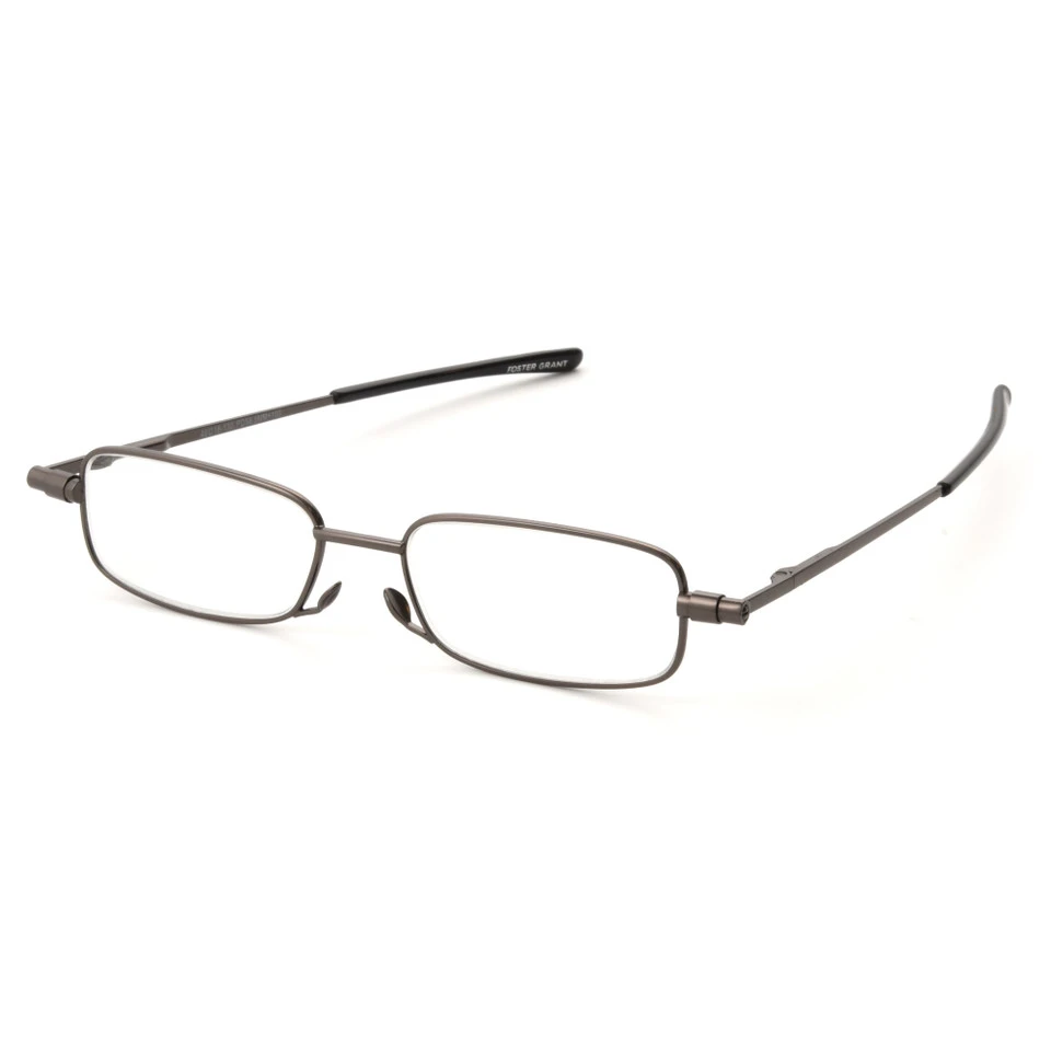 Foster Grant® presents Gavin Fold Flat Micro-Readers. This pair of reading glasses comes in four different magnification levels and is crafted from a gun metal, rectangular frame with plastic lenses.