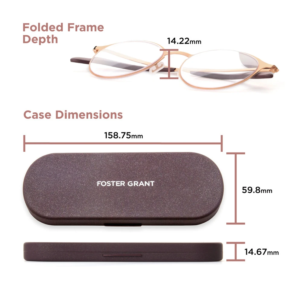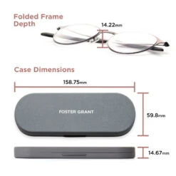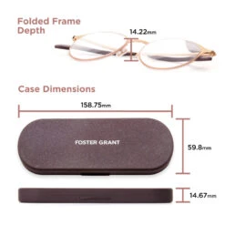 The line of Super Flat eyewear from Foster Grant® is ultra-compact and ultra-portable. These reading glasses are slim enough to fit in any purse or pocket when you’re on-the-go. And they function just as efficiently and fit just as comfortably as our standard-sized styles. Every Super Flat style includes a coordinating hard case that’s 59.8mm x 158.75mm x 14.67mm (2.35 in. x 6.25 in. x 0.58 in.).