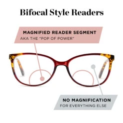 Karleen Pop of Power® Bifocal** Style reading glasses bring colorful flare to reading, work and other tasks. The cat eye frame is mostly a soft milky red color that gradates to a warm brown tortoise around the lenses. Look good and see well all day with comfortable and secure spring hinges.