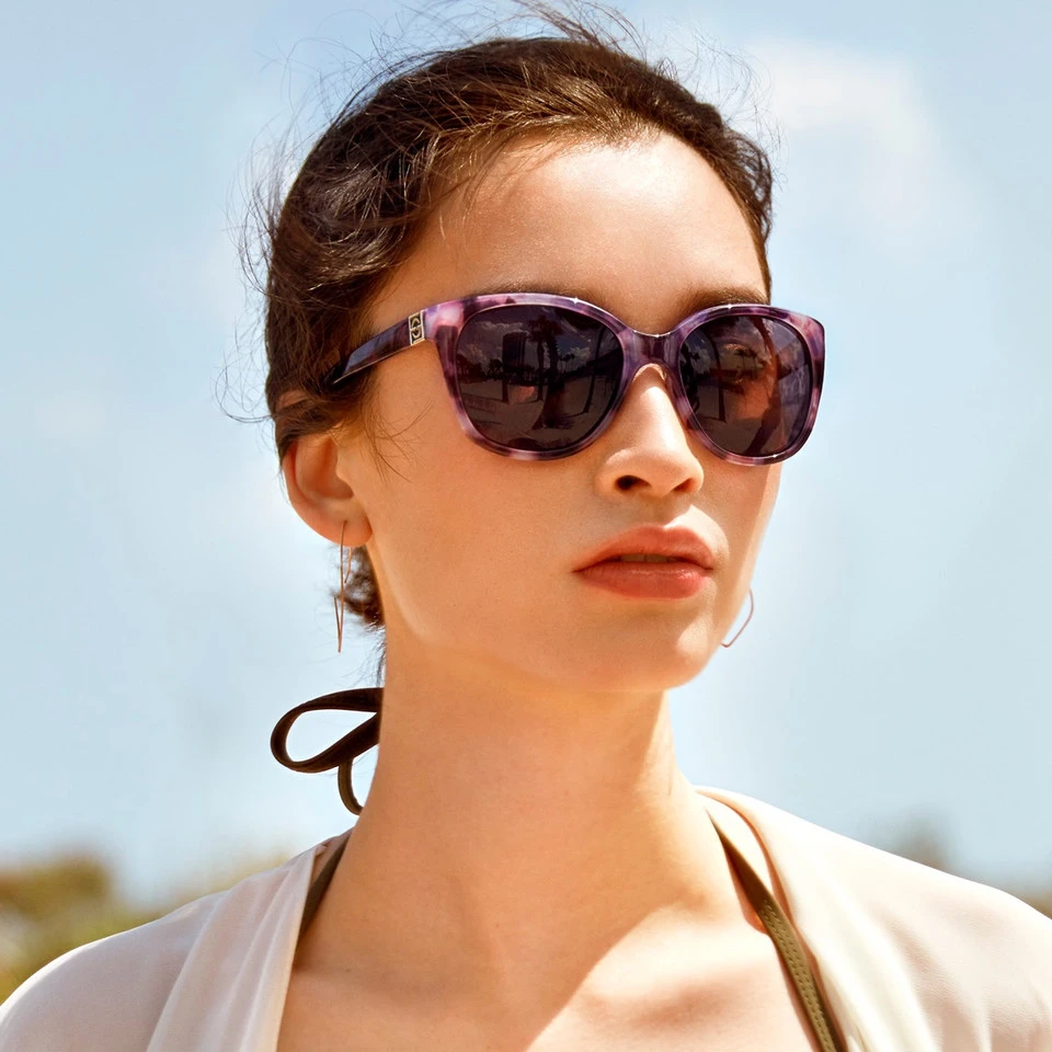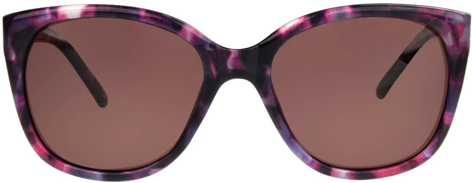 These striking purple and pink patterned frames wrap around a brown tinted polarized lens for a feminine and sophisticated look. Polarized lenses help reduce glare and increases contrast for enhanced visual clarity and comfort.