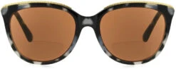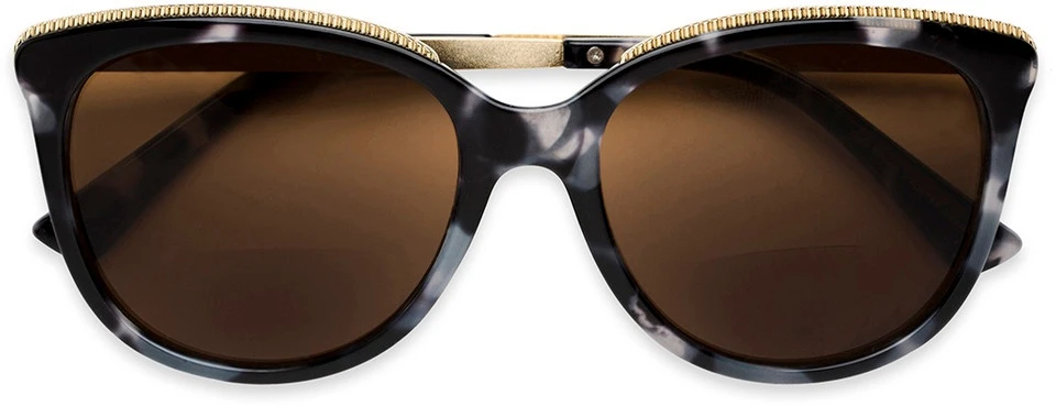 Milky tortoise print plastic gets added edge via ribbed metal accents at the brow and temple of these cat-eye Sofia Vergara® x Foster Grant® women’s SunReaders.