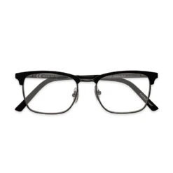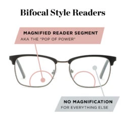 Perkins Pop of Power® Bifocal** Style reading glasses bring an air of retro cool to reading and other tasks. These reading glasses have a classic club frame made of satin dark gunmetal with matte rubberized black brows and tips. Adjustable nose pads and spring hinges offer you all-day comfort and security.