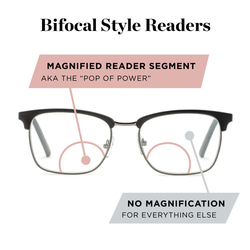 Get just the pop of magnification you need to read with Pop of Power® Bifocal** Style reading glasses. Each lens features a magnified reader segment at the bottom; the rest of the lens is unmagnified. And the whole lens helps to filter 30% of potentially harmful blue light* produced by computers and other artificial and natural sources, including the sun. So, you can keep your glasses on—and your vision clear—when you shift between reading and looking up to see across the room or interact with others.