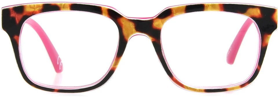 Ree makes a bold statement as part of Foster Grant’s Modera collection and you can too. This square shaped reading glass frame features a shiny tort design a top a bright pink base.