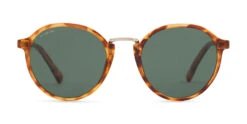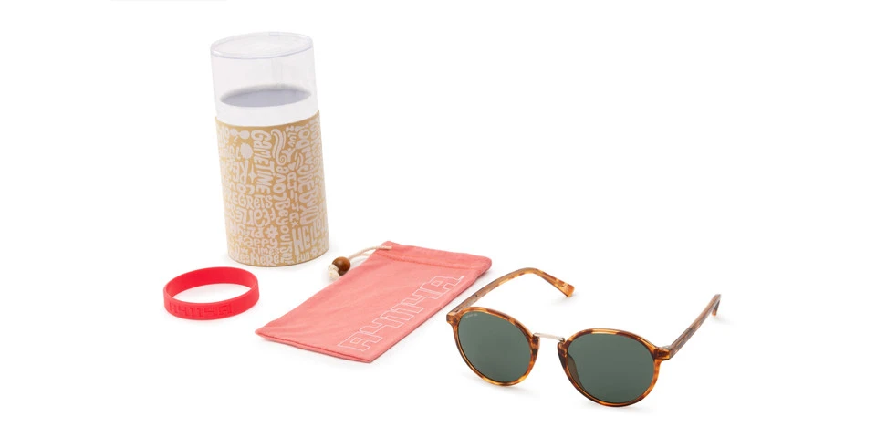 Peace, love and sunshine. Enjoy them all with Summer of Love sunglasses by Foster Grant. These classically styled sunnies bring warmth and texture to any look with their round honey tort frames made with 50% recycled plastic* over a metal wire core and gold-tone metal accents. The lenses are an earthy greenish-grey; they are scratch-resistant and offer 100% UVA-UVB protection. Comes with a pink tensil case (marked with A4114A® — All For One, One For All) and coordinating Azalea Pink rubber bracelet in a reusable paper tube.